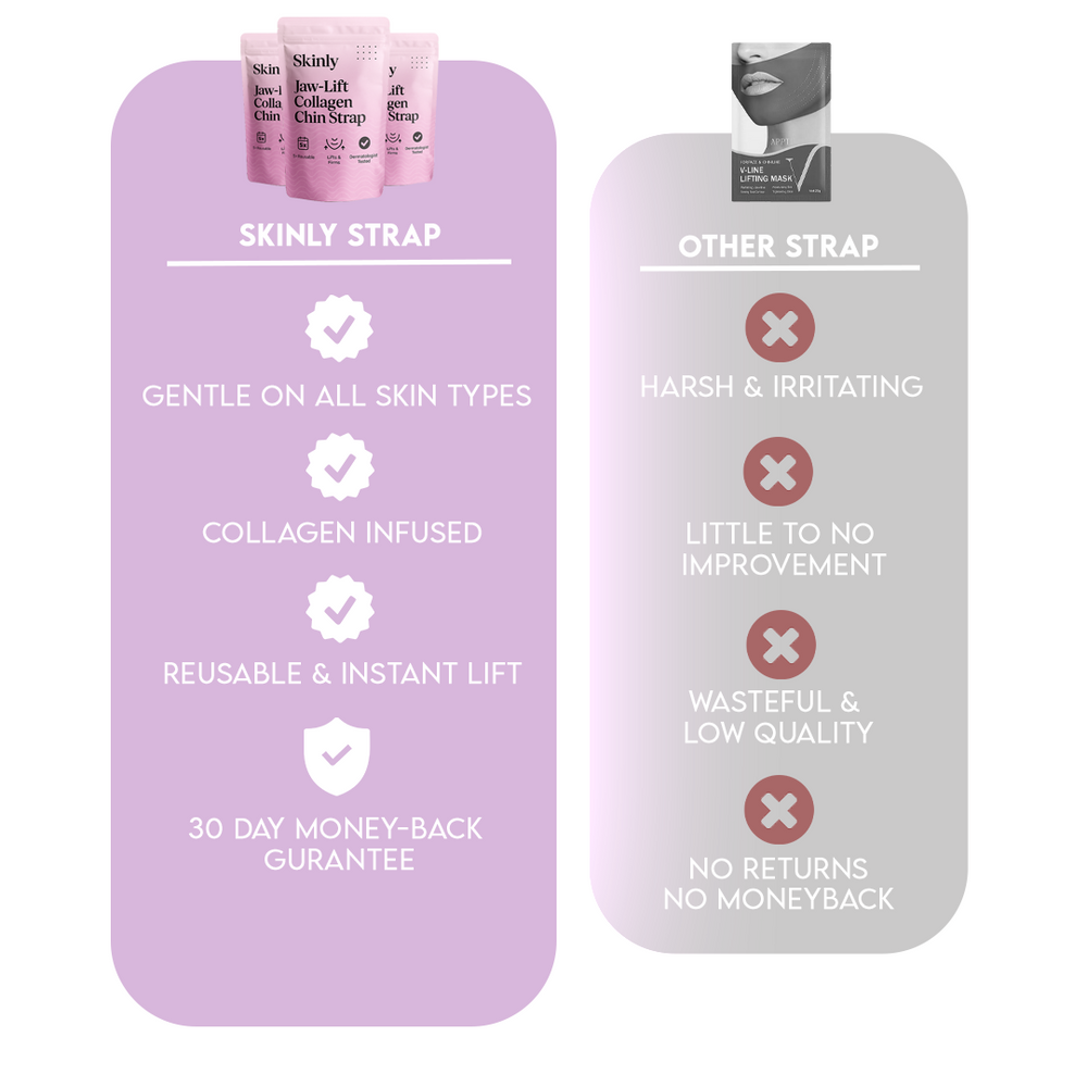 Say goodbye to sagging skin. The Skinly Jaw-Lift Collagen Strap lifts, firms, and hydrates your face in minutes, no costly treatments needed. Your simple at-home facelift.